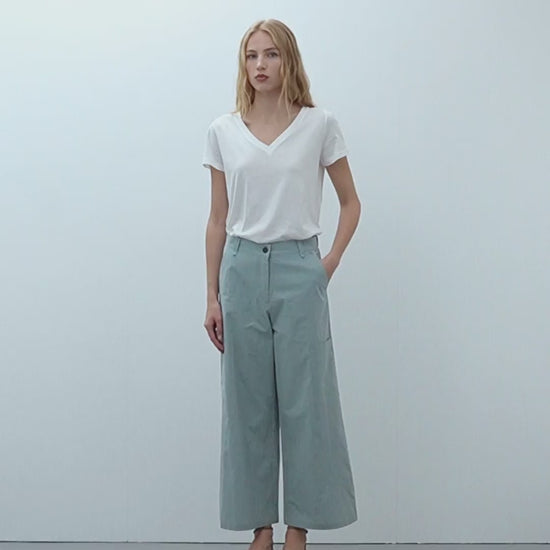 Pantalón culotte de tiro alto confeccionado en tejido de popelin. Cierre frontal con cremallera y botón. Bolsillos laterales y bolsillos tipo cargo. Puedes encontrar su chaqueta a conjunto.