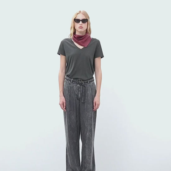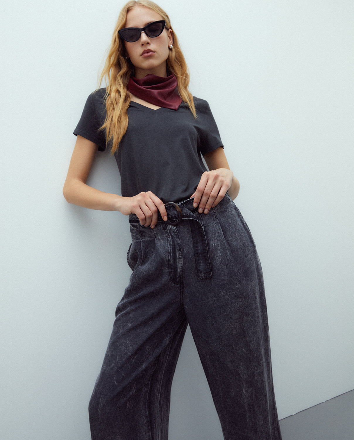 Vaquero en tencel 100% de tiro alto tintando en prenda lo que le aporta un efecto desgastado. Cierre con botón y cremallera y bolsillos laterales. Incluye cinturón bordado con hilo en contraste negro. Puedes encontrar su camisa a conjunto.