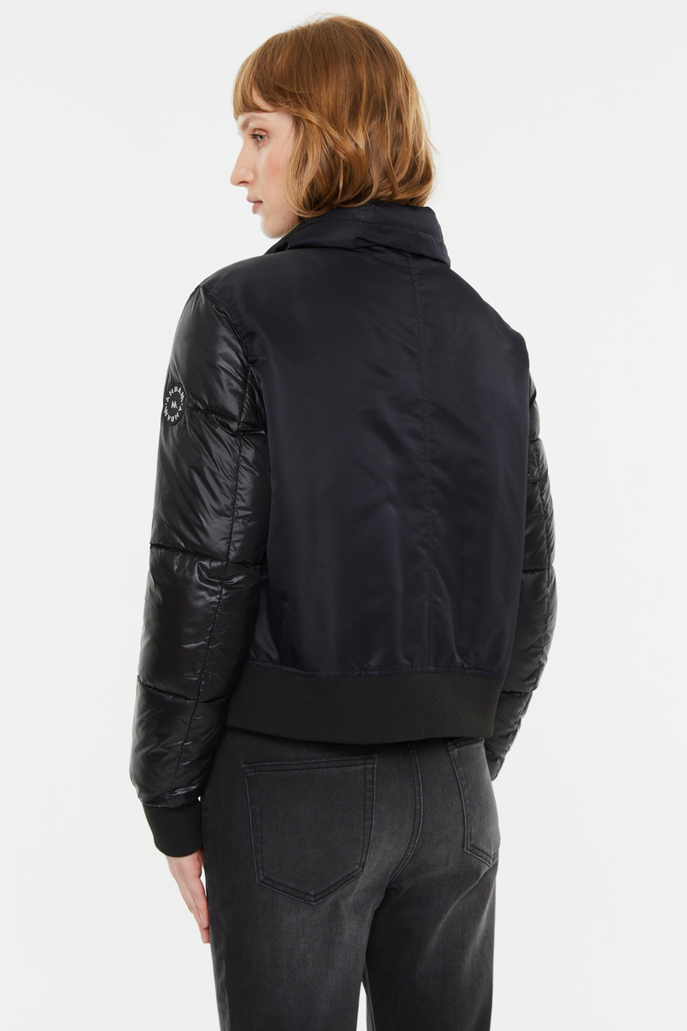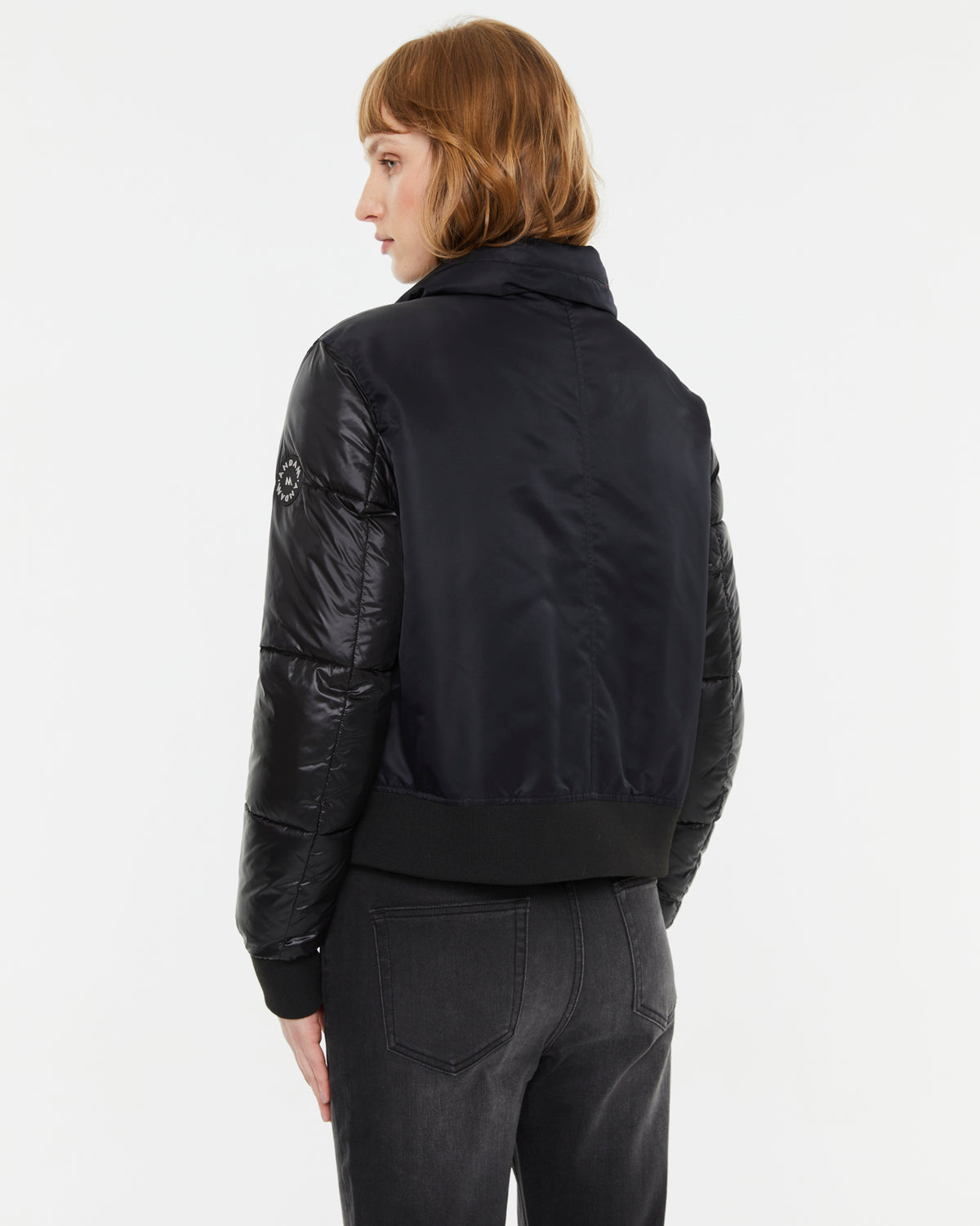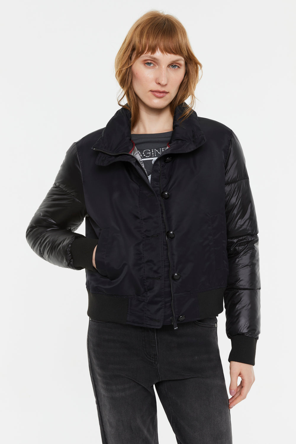 Chaqueta corta acolchada tipo bomber.Cuello alto y cierre con cremallera y botones metálicos tipo militar. Bolsillos tapeta. Puños de canalé elásticos. Etiqueta logo marca en manga y bajo. Regular fit.