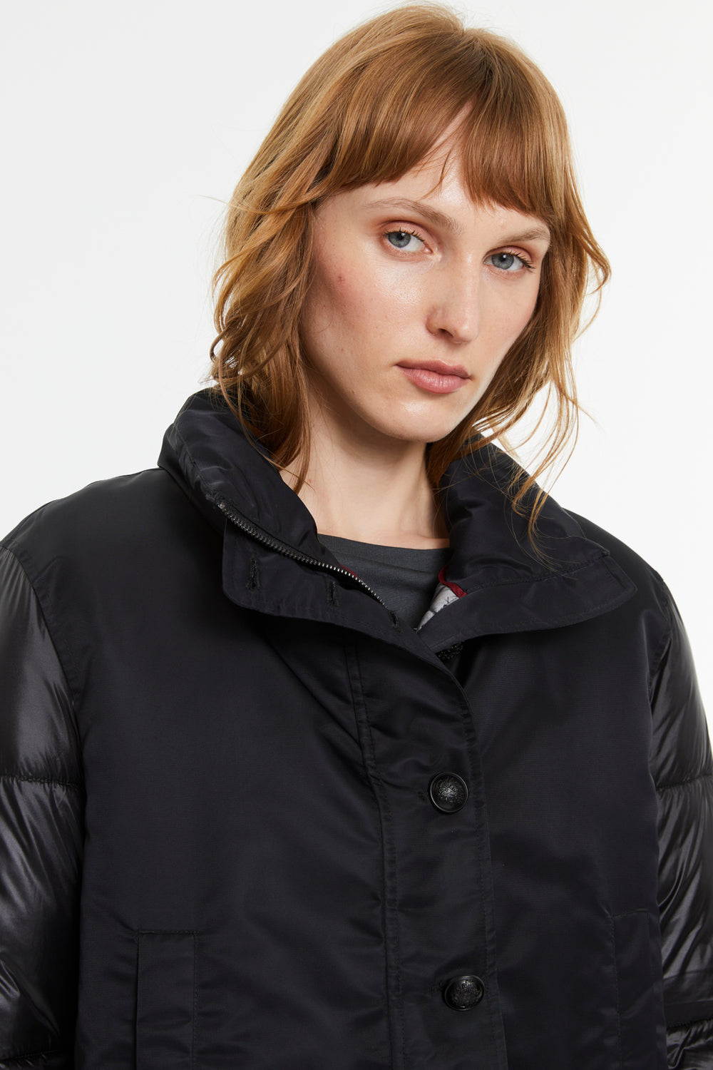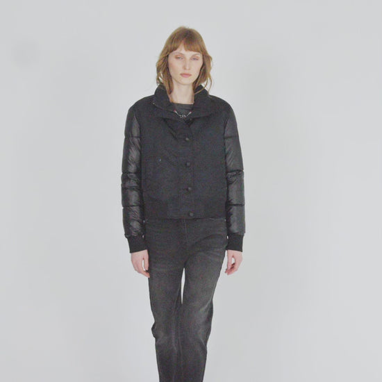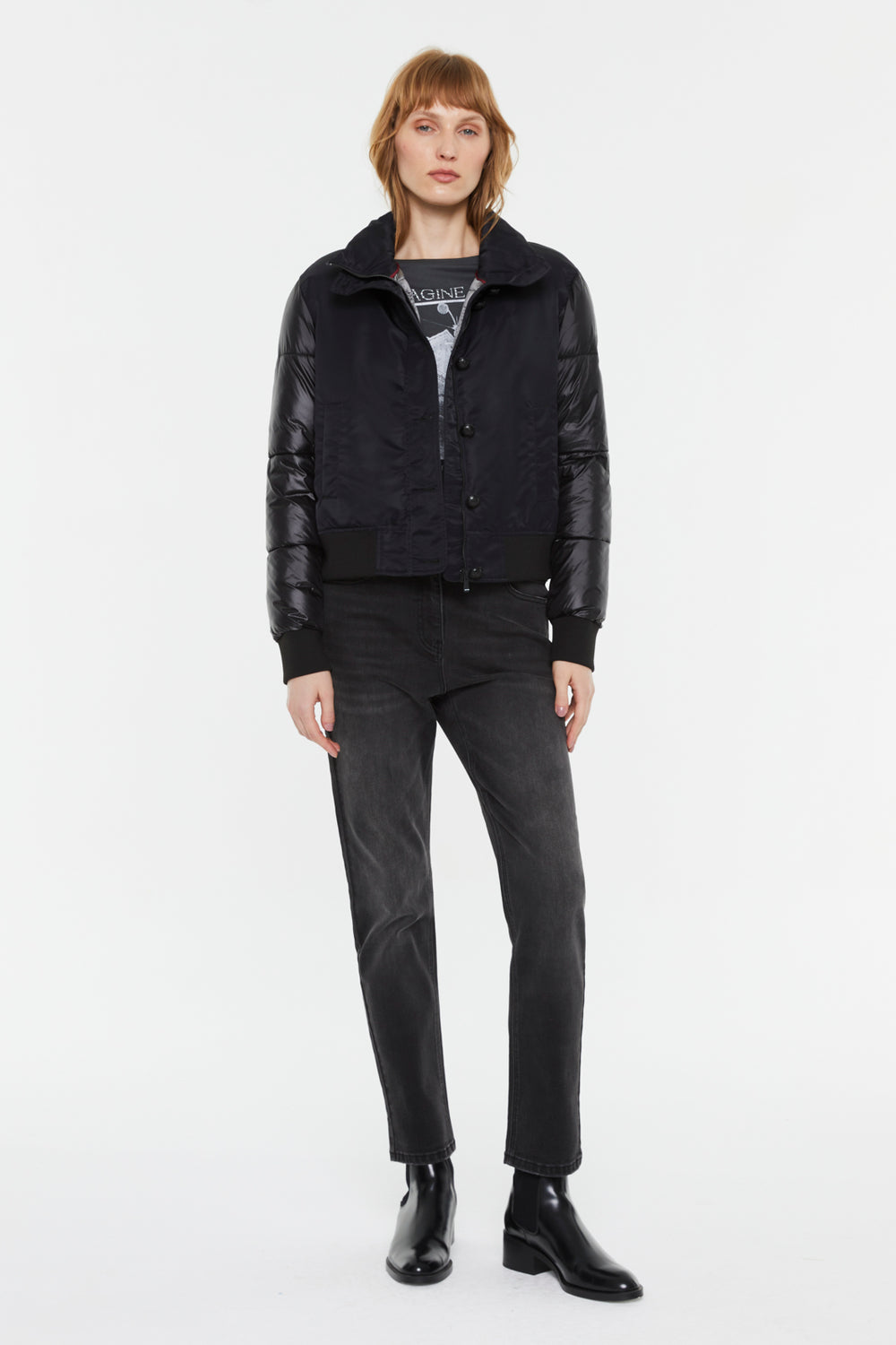Chaqueta corta acolchada tipo bomber.Cuello alto y cierre con cremallera y botones metálicos tipo militar. Bolsillos tapeta. Puños de canalé elásticos. Etiqueta logo marca en manga y bajo. Regular fit.