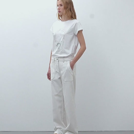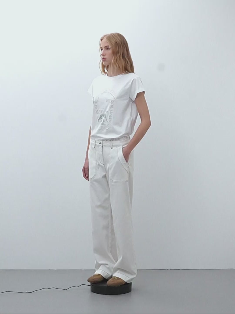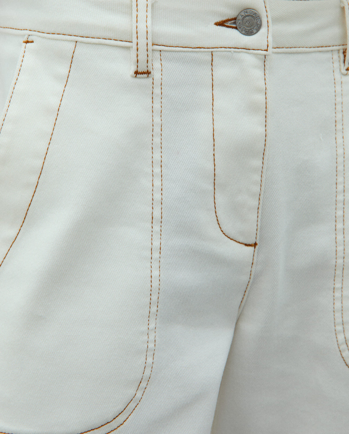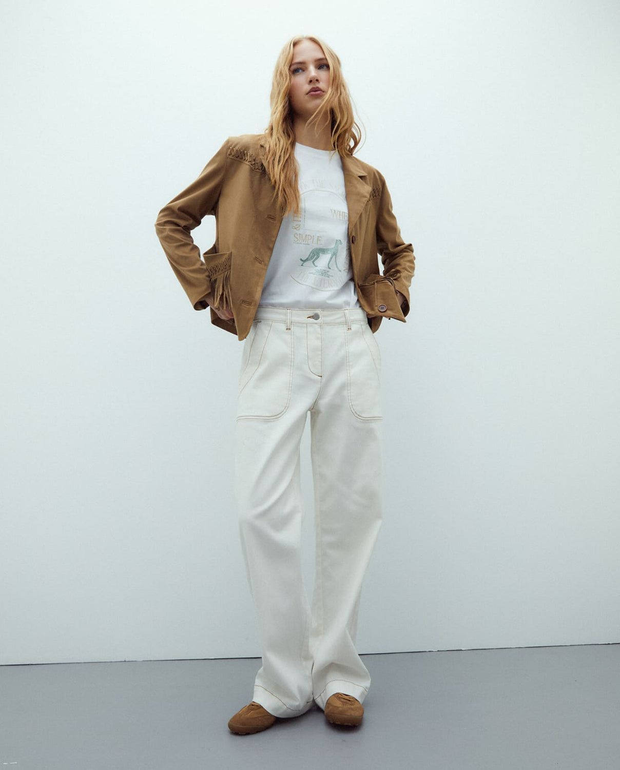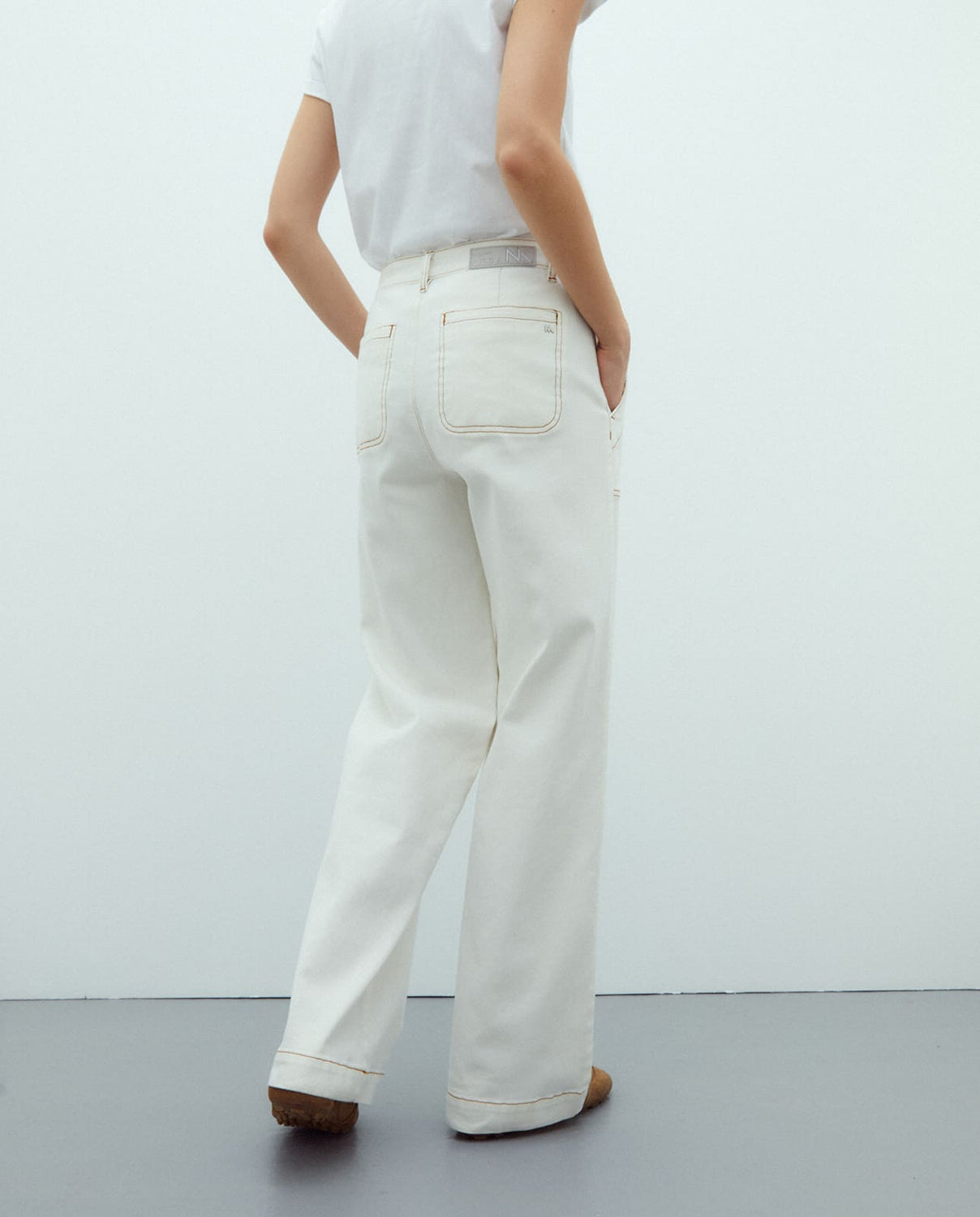 Vaquero recto de tiro alto, cierre con botón metalizado y cremallera. Bolsillos laterales con pespunte a contraste camel creando un efecto de bolsillo plastrón. Bolsillos en trasero contrastados con pespunte en camel. Es un vaquero muy cómodo y elástico.