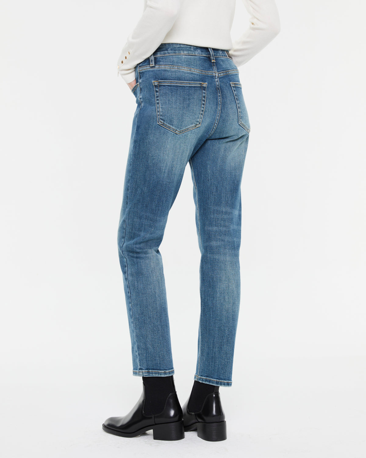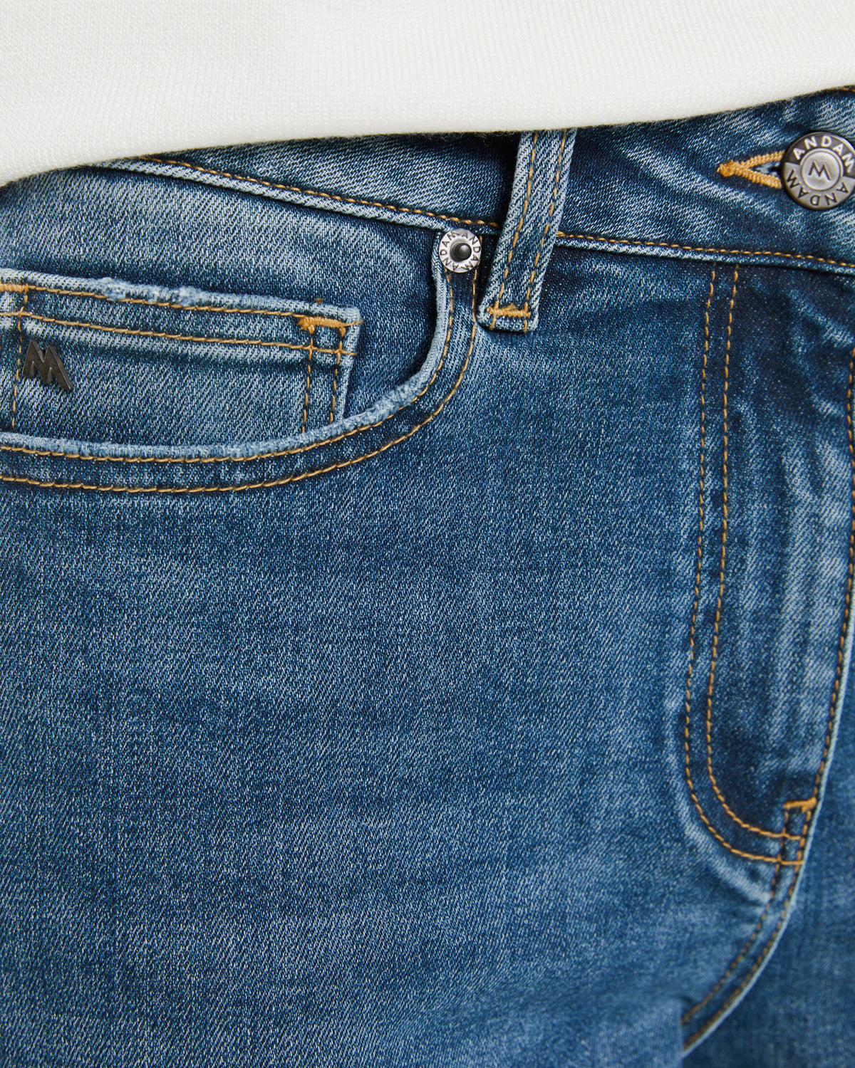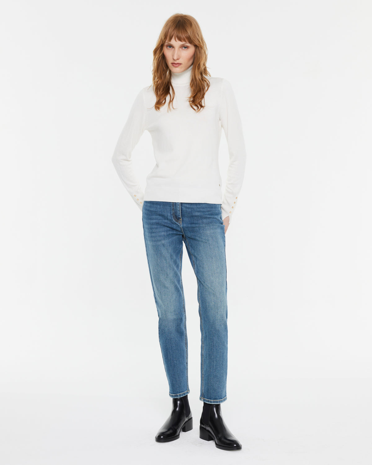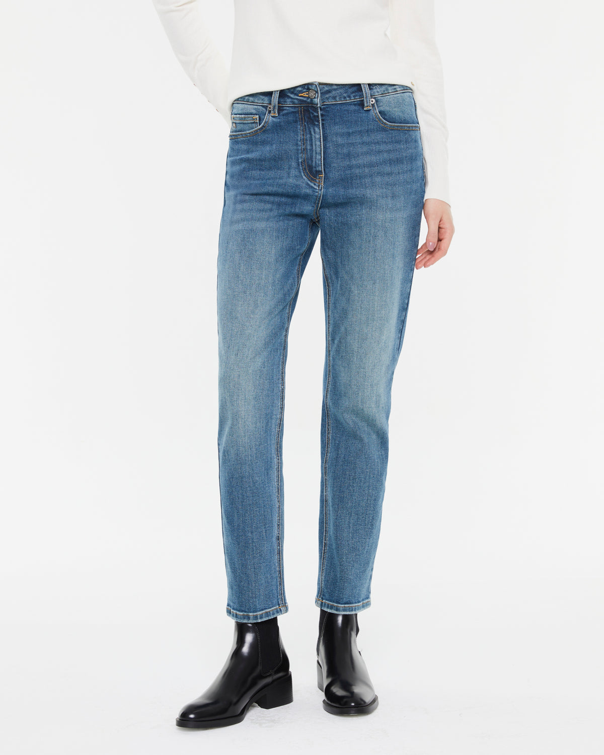 Vaquero recto de tiro alto, cinco bolsillos, cierre con botón metalizado y cremallera. Es un vaquero cómodo, elástico y favorecedor que realza tu figura.