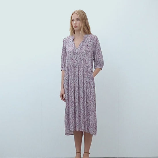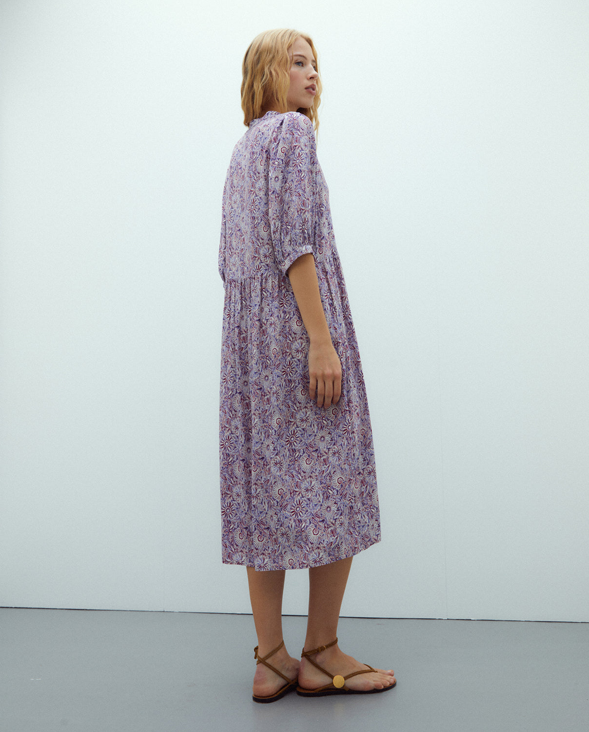 Vestido midi estampado flores de cuello mao en forma pico y manga francesa. Arrugado en puños y cintura lo que le aporta al vestido un aire muy boho y actual. Es una vestido muy femenino y favorecedor. Regular fit.